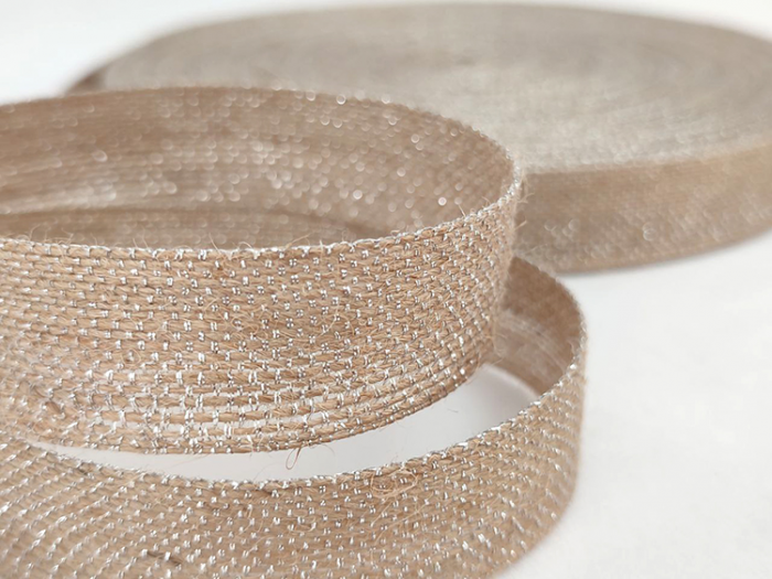 Стрічка джутова 2,5 см, з люрексом, срібло 50 м в рул.