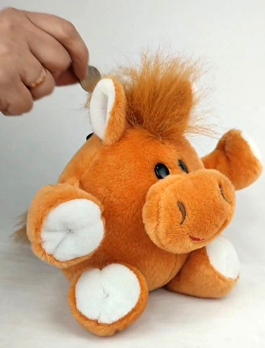М'яка іграшка Конячка не містить шкідливих для здоров'я речовин. Скарбничка з музичним елементом. Коли у скарбничку кидають монетку, звучить пісенька.