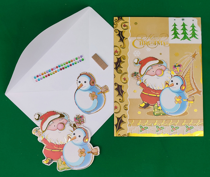 До листівки додаються стрази, вирізані фігурки з паперу і кріплення з пінопласту. Наклеївши їх на листівку, можна отримати об'ємне зображення.