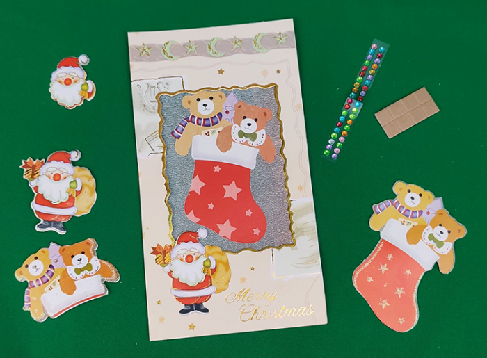 До листівки додаються стрази, вирізані фігурки з паперу і кріплення з пінопласту. Наклеївши їх на листівку, можна отримати об'ємне зображення.