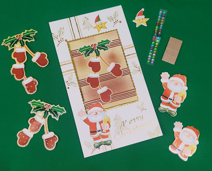 До листівки додаються стрази, вирізані фігурки з паперу і кріплення з пінопласту. Наклеївши їх на листівку, можна отримати об'ємне зображення.